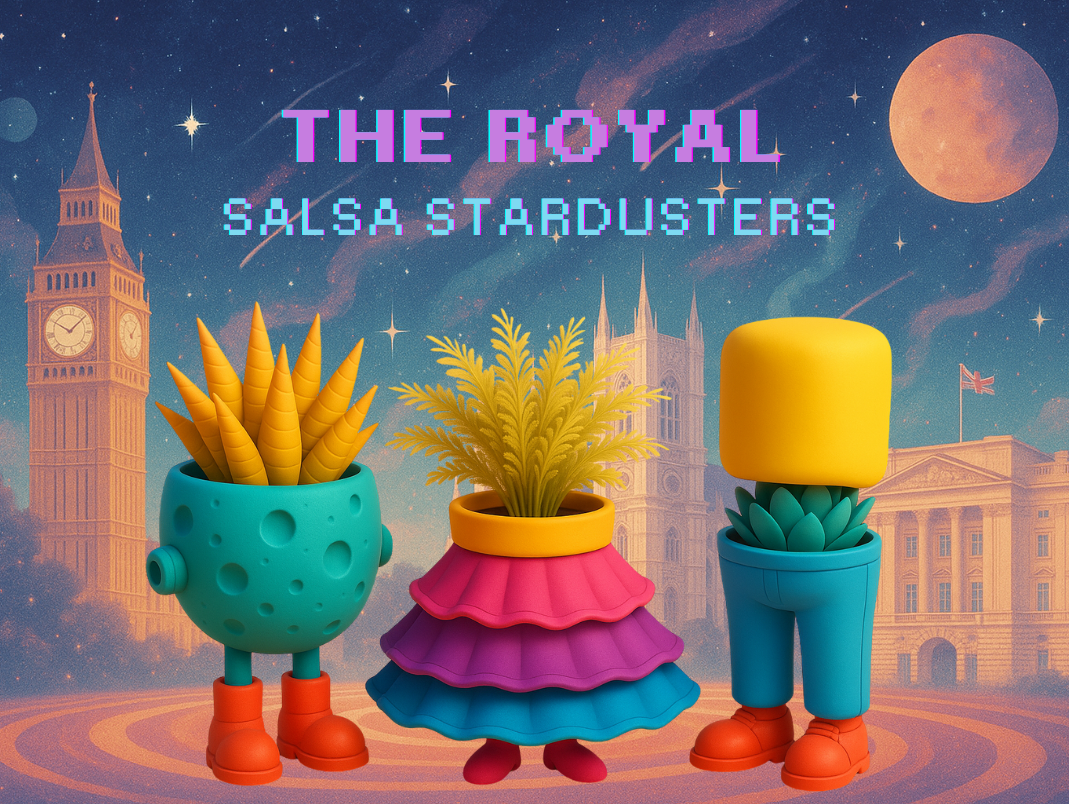 Part of The Royal Salsa Stardusters, a trio of cosmic, salsa-dancing, British-tinged charmers who bring color, rhythm, and playful energy to any space.